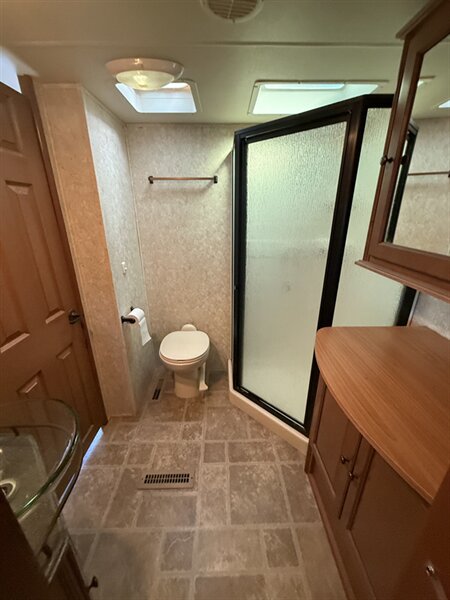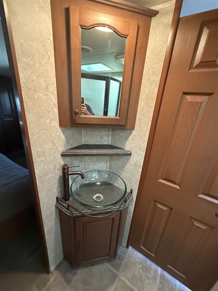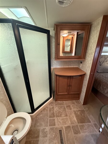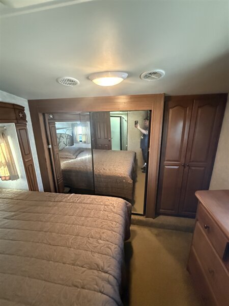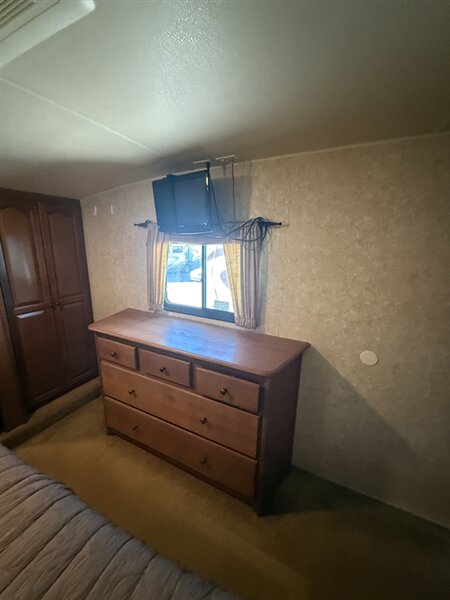 Storage is another strong point, with upper and lower cabinets, pass-through exterior storage, and dedicated spaces for long-term organization. The master bedroom offers a comfortable bed, wardrobe storage, and direct access to the bathroom area.