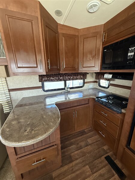 The rear kitchen floorplan provides generous counterspace, a full-size refrigerator, and beautiful cabinetry — perfect for cooking on the road. The open living area features dual slide-outs, a cozy booth dinette, comfortable seating, an entertainment center with a fireplace, and plenty of natural light for a bright, homey atmosphere.