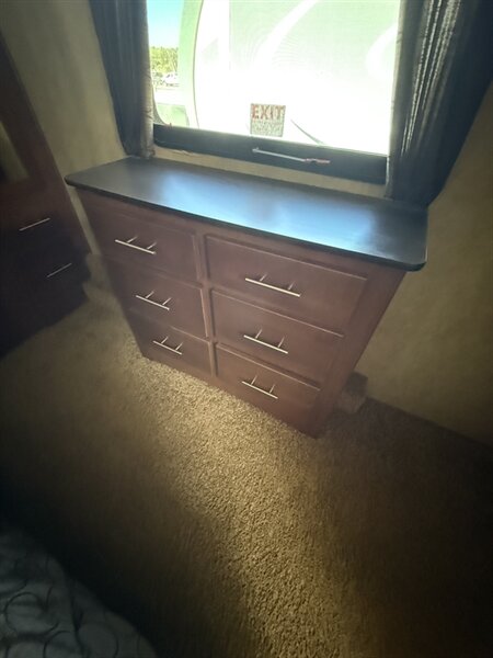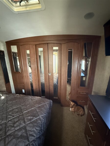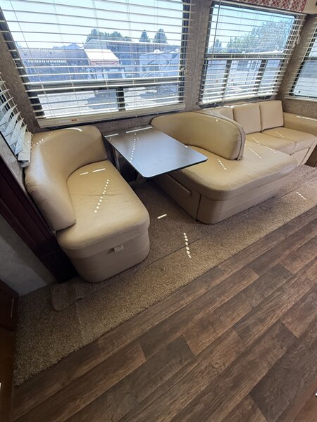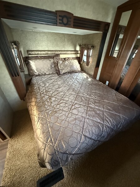 Up front, you’ll find a private master bedroom with a walk-around queen bed, large wardrobe, and washer/dryer prep. The spacious bathroom offers a large shower and extra storage for added convenience.