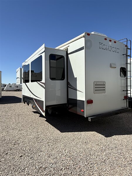 Exterior highlights include a power awning, automatic leveling system, and ample basement storage to bring along all your travel essentials. With dual A/C units, central vac system, and true four-season construction, this Komfort is ready for adventure year-round.
