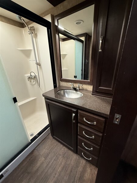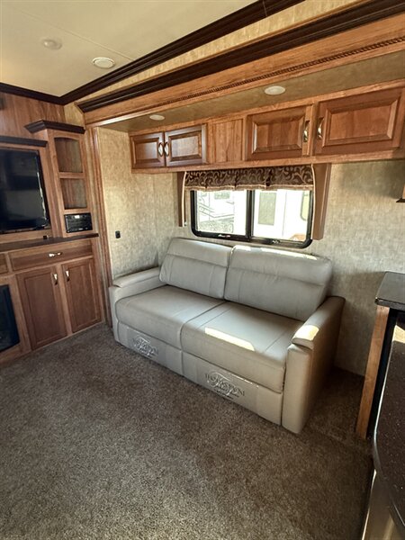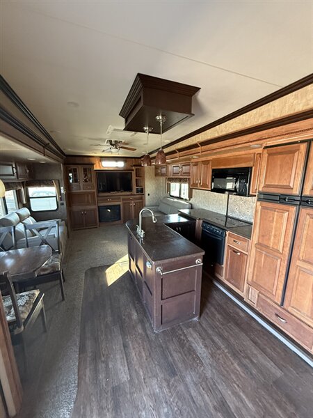 Step inside and you’ll immediately notice the craftsmanship and spacious layout that set the Discovery apart. Rich cabinetry, solid surface countertops, and plush furnishings create a warm, inviting atmosphere reminiscent of a high-end lodge on wheels. The large living area offers theater seating, a sofa, and an entertainment center with a fireplace for cozy evenings indoors.
