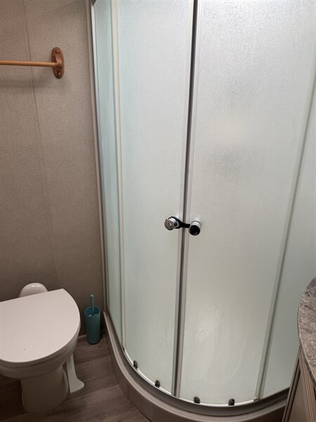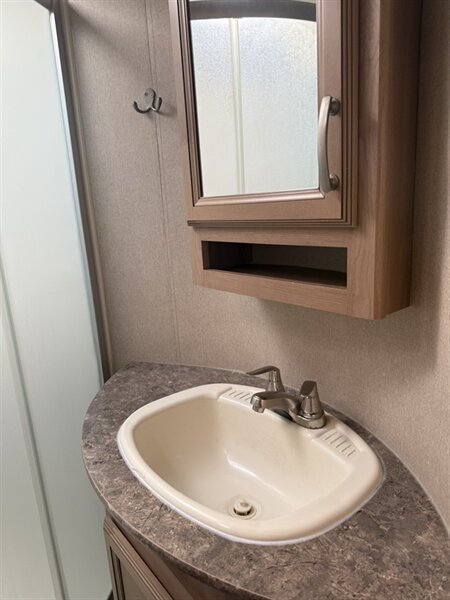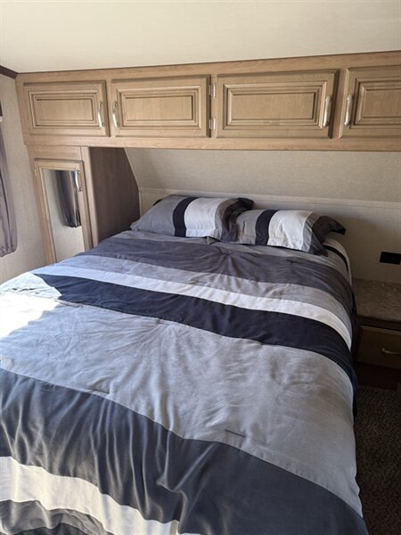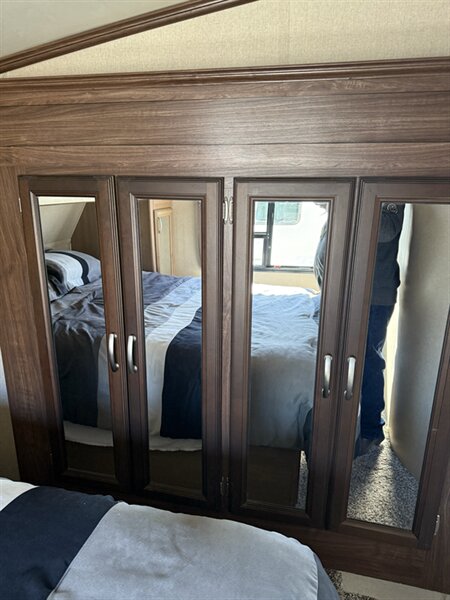 The open-concept living area welcomes you with elegant finishes, rich cabinetry, and modern design touches throughout. Relax in climate-controlled comfort with dual air conditioners, cozy up on cool nights, or entertain guests in style. Enjoy the convenience of auto-leveling, making setup effortless wherever your adventures take you.