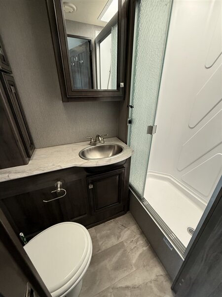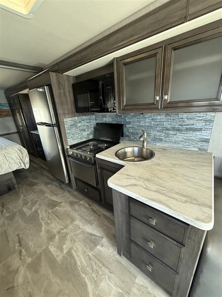 Entertainment is effortless with a 50” exterior LED TV, Bluetooth coach audio, and an upgraded dash display with USB charging stations and a dedicated passenger workstation. Enjoy the residential kitchen, stainless appliances, an oversized fridge, deep sink, and tons of countertop space for cooking on the road. Outdoors, set up with ease thanks to a one-touch power awning and enjoy the exterior kitchen with mini fridge and sink—perfect for grilling or tailgates. Storage solutions abound, with generous pass-through basement compartments, deep pull-out drawers, and a full wardrobe in the king bedroom. Safety, comfort, and innovation combine in a coach that’s ready for your next adventure—turn the key and embrace the journey in this standout Fleetwood Flair 29M.