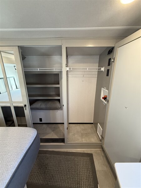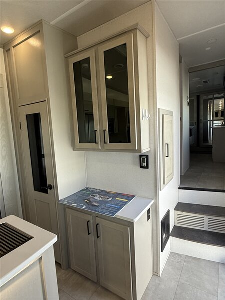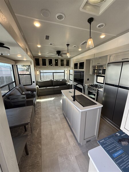 Inside, the RV boasts residential-grade appointments such as an inviting electric fireplace, a ceiling fan for enhanced airflow, and two whisper-quiet ducted air conditioners for year-round climate control. The kitchen is designed for culinary enthusiasts, featuring solid-surface countertops, a large center island, stainless steel appliances, and abundant storage in soft-close cabinets. The luxurious master suite includes a king bed, a spacious mirrored wardrobe, washer/dryer hookups, TV prep, and a generously sized bathroom with a walk-in glass shower and dual vanities for added convenience.