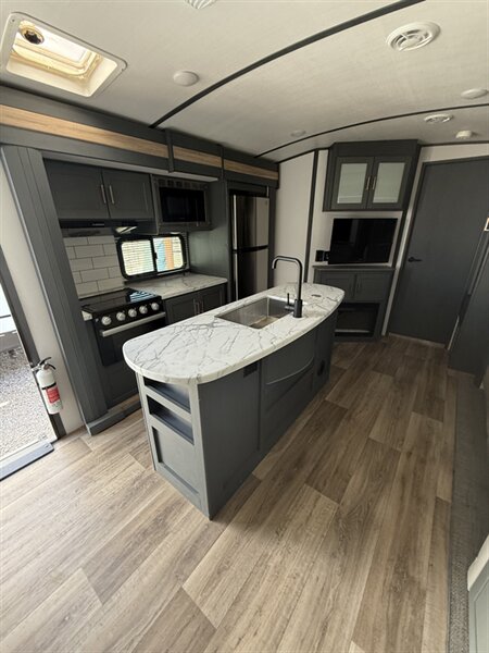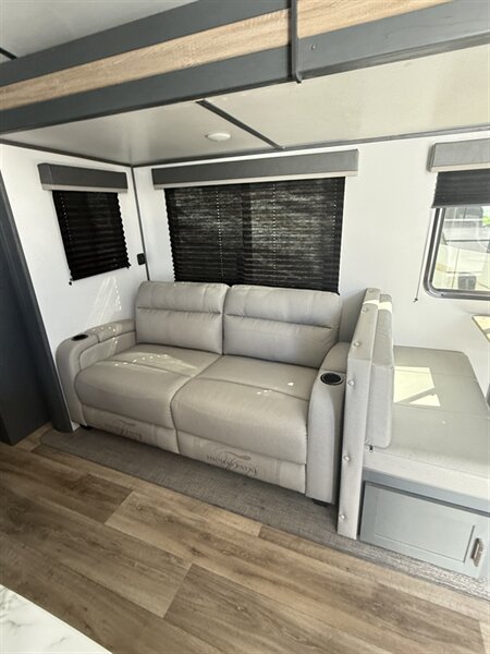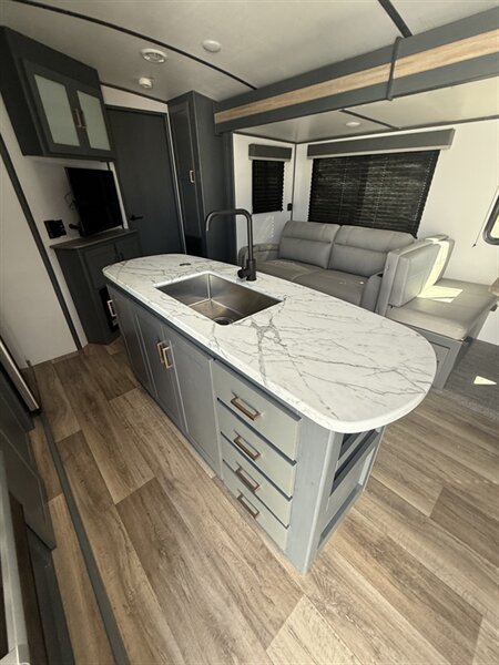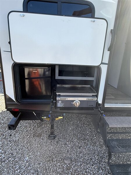 The main living area features an open concept with a large slide-out, entertainment center, and a fully equipped kitchen with stainless appliances, a pantry, and plenty of prep space. Step outside, and you’ll love hosting under the power awning while grilling at the outdoor kitchen—ideal for summer barbeques and sunset dinners. Power stabilizer jacks and a power tongue jack make setup quick and effortless wherever you roam.