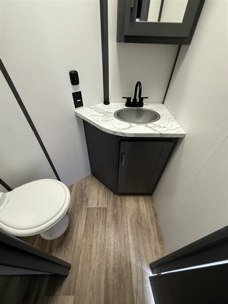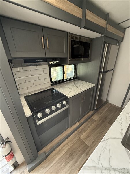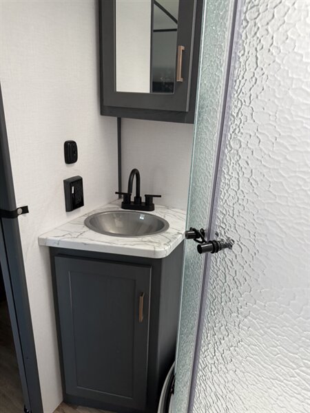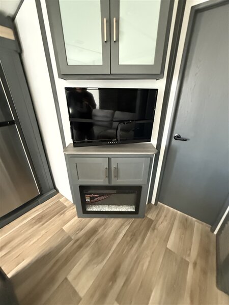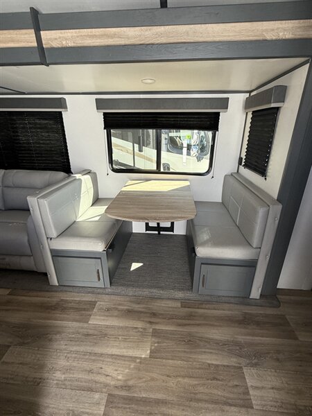 Inside, you’ll find a bright, residential-style interior with ample room for the whole crew. The front private master bedroom offers a queen bed with storage, while the rear bunkhouse includes multiple sleeping spaces—perfect for kids or guests. The bath and a half layout adds convenience, preventing morning traffic jams, and the electric fireplace adds a warm, cozy touch on cooler nights.