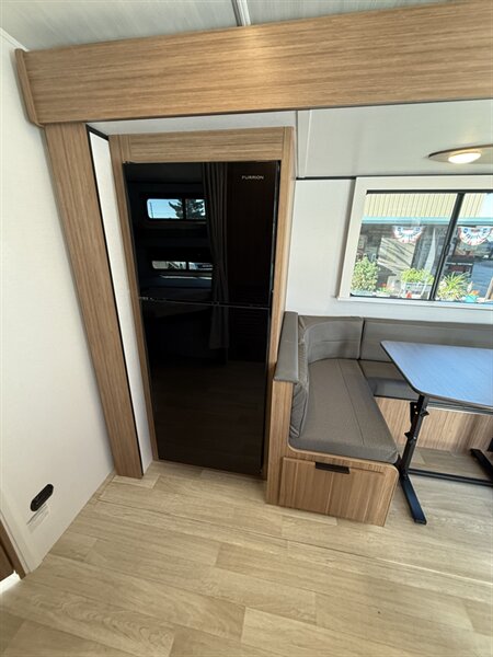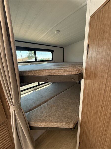 Inside, you’ll find flexible sleeping arrangements for up to eight—featuring spacious double-over-double rear bunks, a private front queen bedroom, and a roomy U-shaped dinette that converts for extra guests. Residential vinyl flooring, frosted cedar cabinetry, and stylish finishes make it feel like home, while the fully equipped kitchen with a 10 cu ft 12V refrigerator, three-burner range, convection microwave, and generous pantry space makes mealtime effortless. The rear bath includes a large shower and plenty of storage to keep everyone organized.